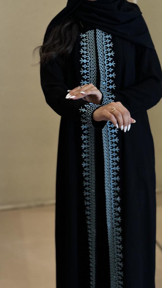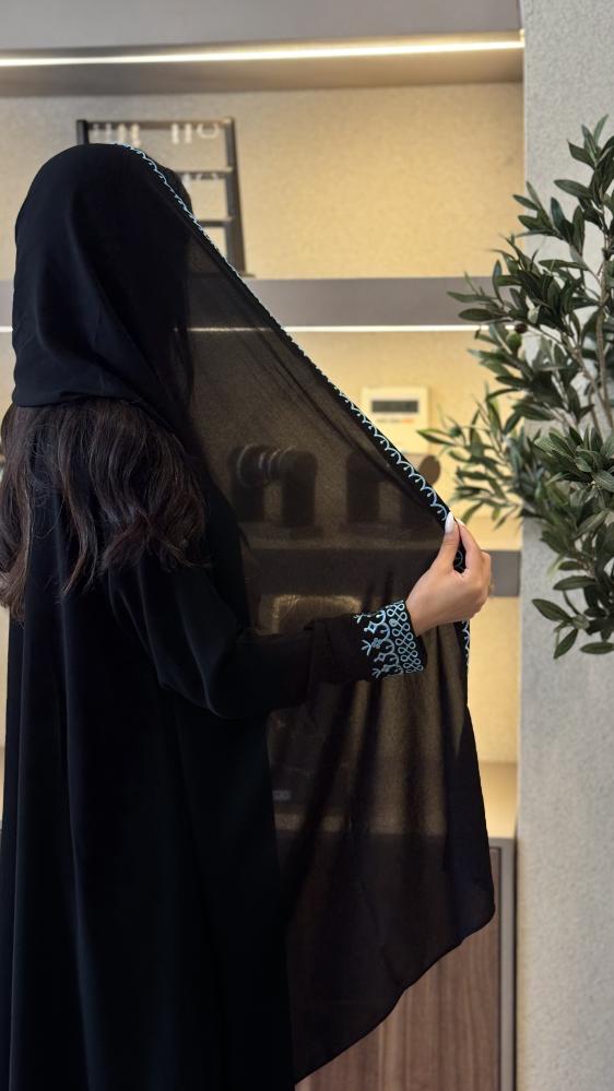 عباية كريب ملكي اسود مع تطريز في العباية و طرف الطرحة