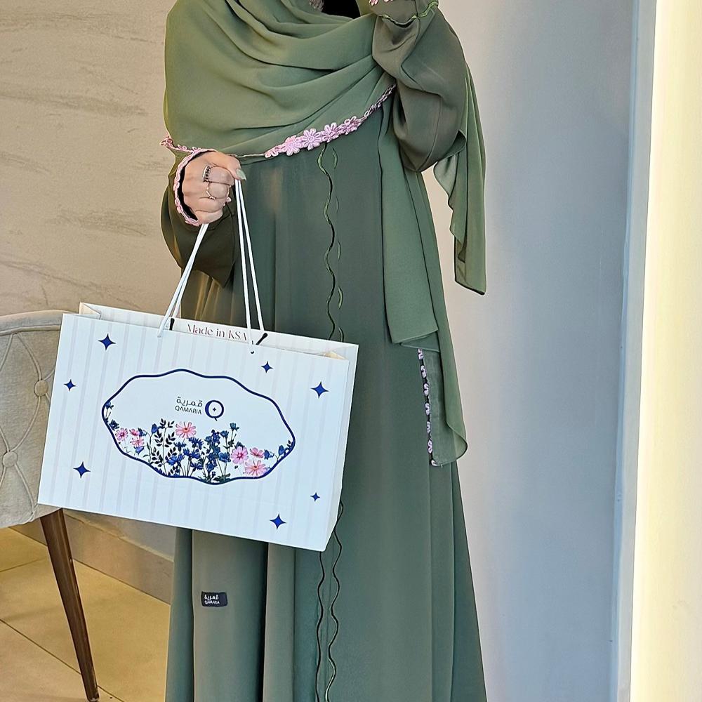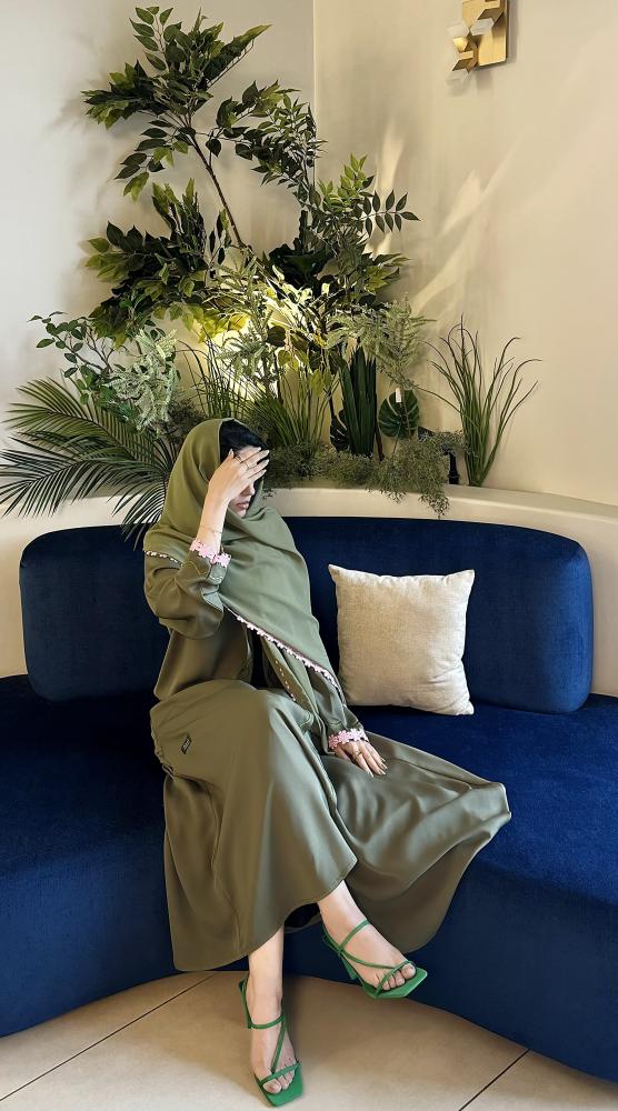 القصة : A LINEعباية بقماش اخضر كريب ياباني مع اضافة كلفة ورد في الاكمام و طرف الطرحه واضافة تطريز بشكل مميز.