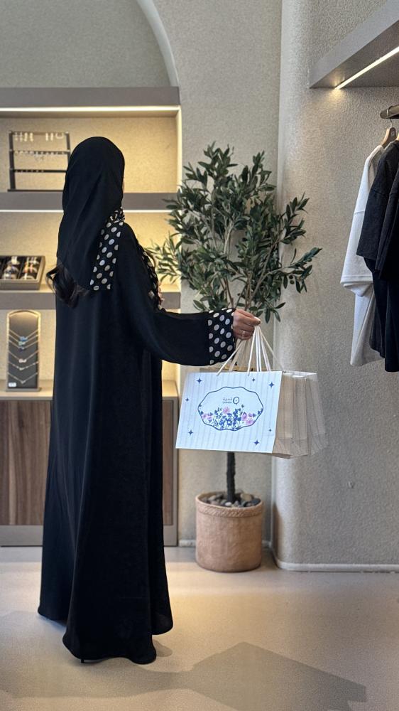 قماش كريب كوري اسود مع اضافة شيفون منقط ابيض في العباية ومع طرف الطرحه 🤩