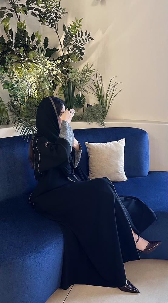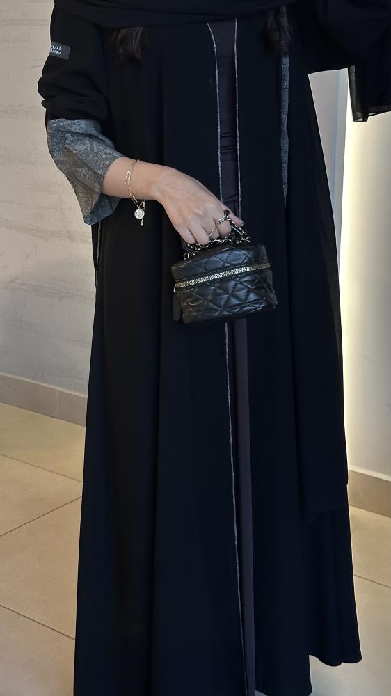 عباية بقماش كريب كوري مع اضافة جاكار رمادي للكم + طرحة ليزر مع اضافة لطرف الطرحة.